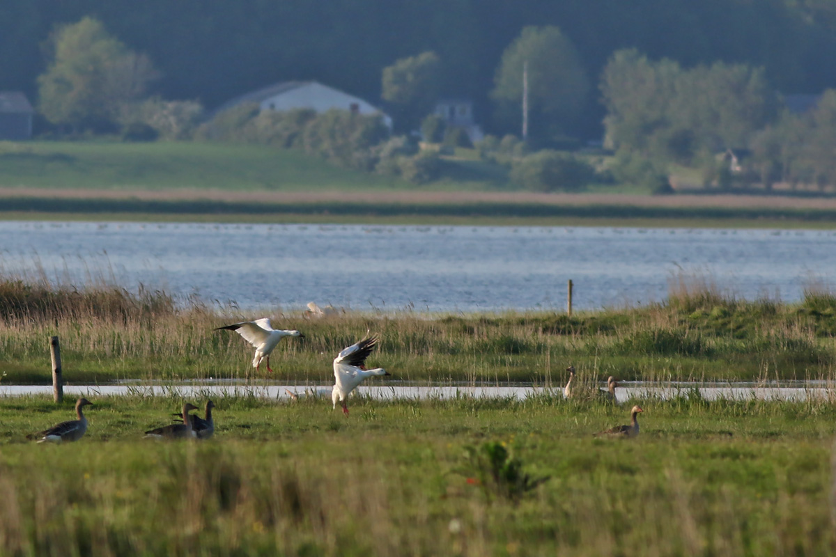 Mit bud er, at de samme to hvide fugle først ses på Salling 16/4 2021, dernæst måske ved Vilsted Sø 17/4 2021, Bygholm Vejle 2/5 2021, dernæst flyver mod syd til Filsø 17/5 2021, for at dukke op i Vejlerne igen i juni og juli 2021, hvor der dog kun ses én fugl, igen sammen med grågæs.