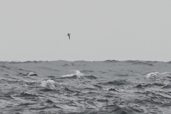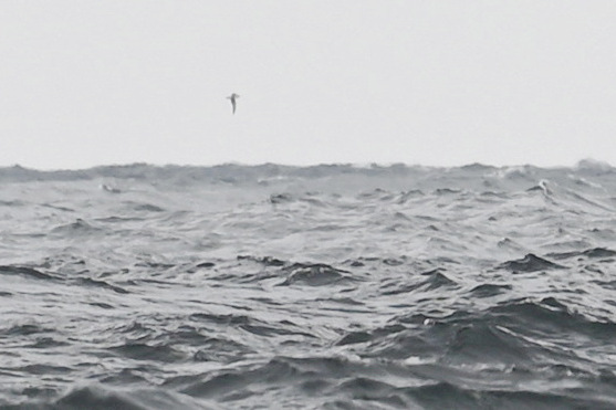 Den sidste af de ni sjove stormfugle passerede kl. 11:25. Første glimt af denne fugl var da den passerede gennem kikkertfeltet og forsvandt bag skibet. Den kom kort efter frem på den anden side af skibet. Det første indtryk var, at det var en mallemuk. Efter kort tids obs blev vi enige om, at det ikke var tilfældet – den var for lille og flugten passede ikke på arten. Da vi begge så fuglens hvide krop, antog vi, at det måtte være en Almindelig Skråpe. Vi så ikke oversiden med sikkerhed. Det var meget svære observationsbetingelser, da der var bølger og, vi var nødt til at stå op. Vi fik således ikke noget klart indtryk af vingeformen. Under observationen udviste vi dog usikkerhed om det nu kunne være noget andet, og derfor tog vi så mange billeder af fuglen som muligt for, at vi kunne dokumentarer bestemmelsen til Almindelig Skråpe. Men det skulle billederne vise sig ikke at kunne bekræfte. Hvad billede serien i stedet viste, var en serie af en Petrel med jizz og dragt som Desertas/Fea’s/Zino’s Petrel!!