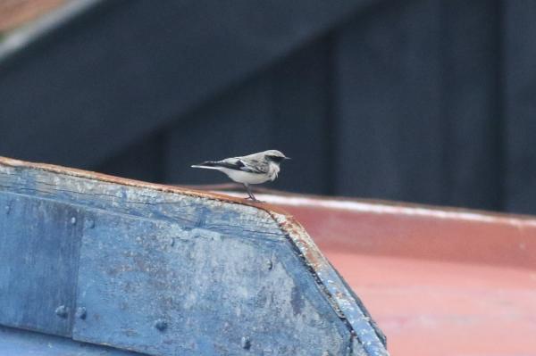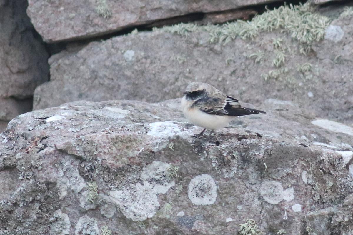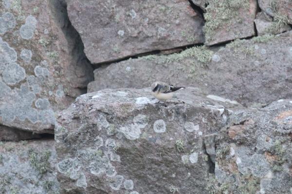 Skøn afslutning på en ellers stille dag på kontoret. Fuglen var ekstrem flyvsk. Fundet af Gunhild rastende på fodboldbanen omkring kl 15, hun fortalte ved senere møde med Kim, at hun havde set en stenpikker han på boldbanen, dette melder Kim ud på Zello 15.42. Da undertegnede lige var i færd med dataindtastning lod jeg den vente lidt, og tænkte egentlig at folk ville tjekke op på dyret imens. Kl 16:02 går den dog ikke længere, den nager mig - for der må være en grund til at hun siger en han, og det må jo være fordi den har sort maske. Jeg møder Kim på vejen til boldbanen, og bliver lige hurtig sat ind i hvor hun havde set den. Jeg får tjekket boldbanen, rantzau, verdens ende og området deroppe, og går ude på stenene ved østsiden af Christiansø i håb om at den er røget derud. Ak! Kim er dog i mellemtiden blevet lidt lun på min iver i at genfinde fuglen, så han vil tjekke vestsiden af Christiansø fra Frederiksø af. Han når dog lige derover, før han ser en stenpikker hale flyve væk fra ham. Han får ringet mig op, og jeg skynder mig derover. Fuglen er dog væk på daværende tidspunkt, men jeg får den genfundet efter 5 minutter på vestsiden af Frederiksø - og kan straks se at der er tale om en Nonne/Middelpik. Jeg får kaldt de andre over, og vi får den set fint - klokken er her 17.16, så lyset er allerede pænt svinende. Dvs billederne er ikke de bedste, vi synes dog den er meget lysrygget, hvilket tegner bedste på Østlig Middelpik. Fuglen forsvinder for os før folket når frem, og til trods for eftersøgning +10 mand, så genfindes den ikke på Frederiksø. Helt ind til 17.55 skal der gå, før jeg genfinder fuglen på den sydlige del af Møllebakken. Jeg er desværre den eneste der ser den her i 2 minutter, før den drager over Coucherouns morterbatteri, og lander i stenene uden for syne. Til trods for ihærdig eftersøgning, må vi give op 18.30, da mørket har sænket sig over skæret. Billederne jeg får på Møllebakken er lidt bedre, og efter granskning og diskussion af fuglen - må det være en adult han Nonnestenpikker. |
