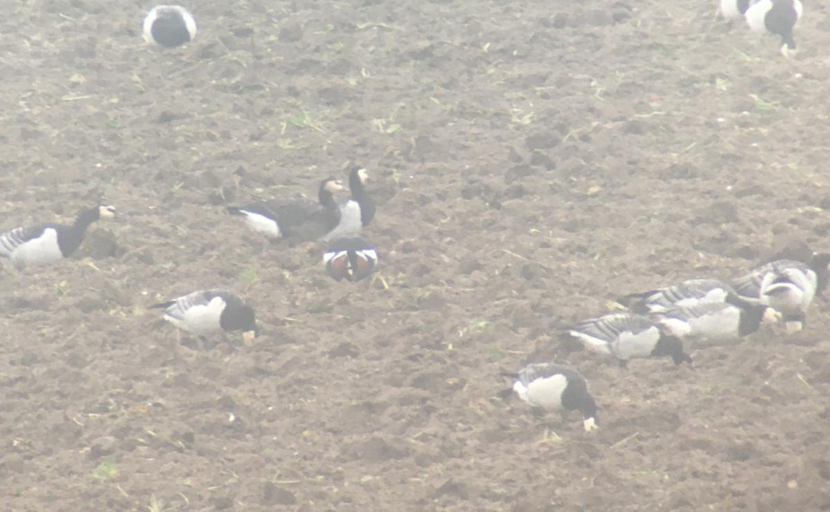 Ja det ser sådan ud, men jeg tror det er mudder den har på næbbet, flere Bramgæs havde også mudder som denne på næbbet. Fuglen havde sorte ben, og da den fløj med den Rødhalsede var det tydeligt at overgumpstegningen var den samme som denne.